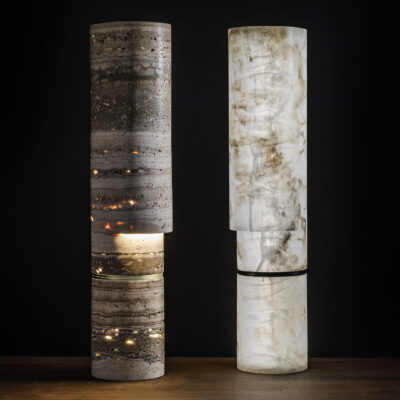 The large TEST-ONE table lamp surprises at the first touch of its body. It evokes a modern cylinder that finds its expression through the different materials. White as the moon in polished Onyx Ice, the stone from a sculptural opalescence transforms into a shining brutalist creation. Mysterious as a dying star with the Rapolano Travertine that lets spreading glimpses from the cavities of the stratifications and the undercut with its crescent characteristic.