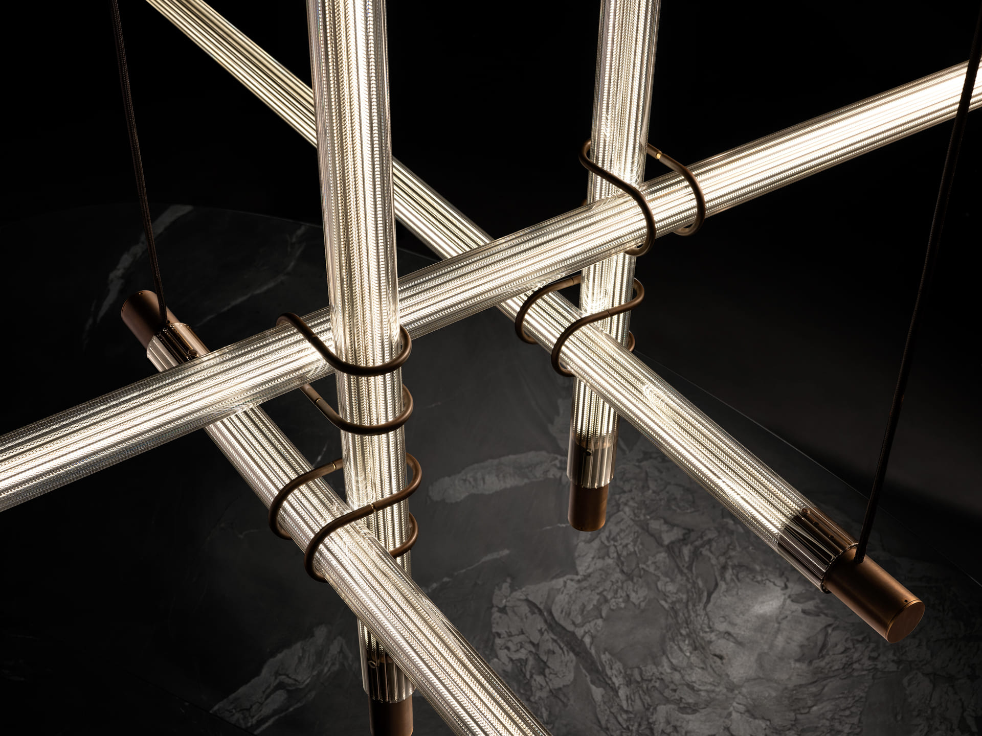 The suspension lamp, Spyder X, an ensemble of slender, fluted, borosilicate glass cylinders, exquisitely finished at each end with rounded burnished brass protuberances, horizontally and vertically arranged and connected in balanced symmetry, interprets a performance of lightness and elegance.