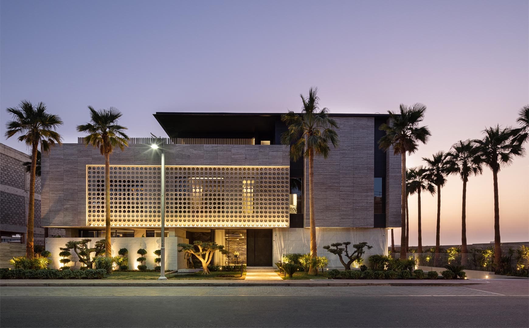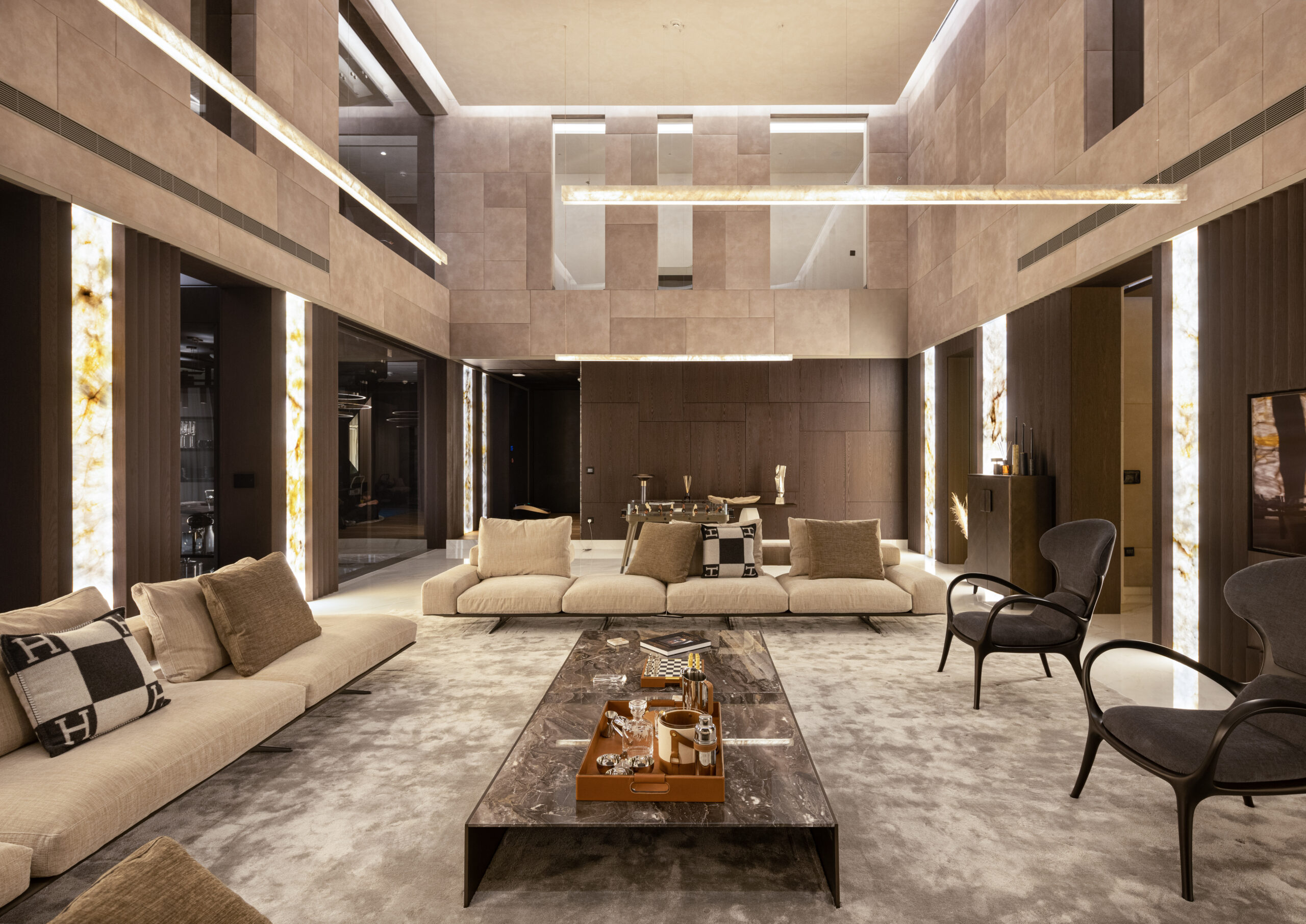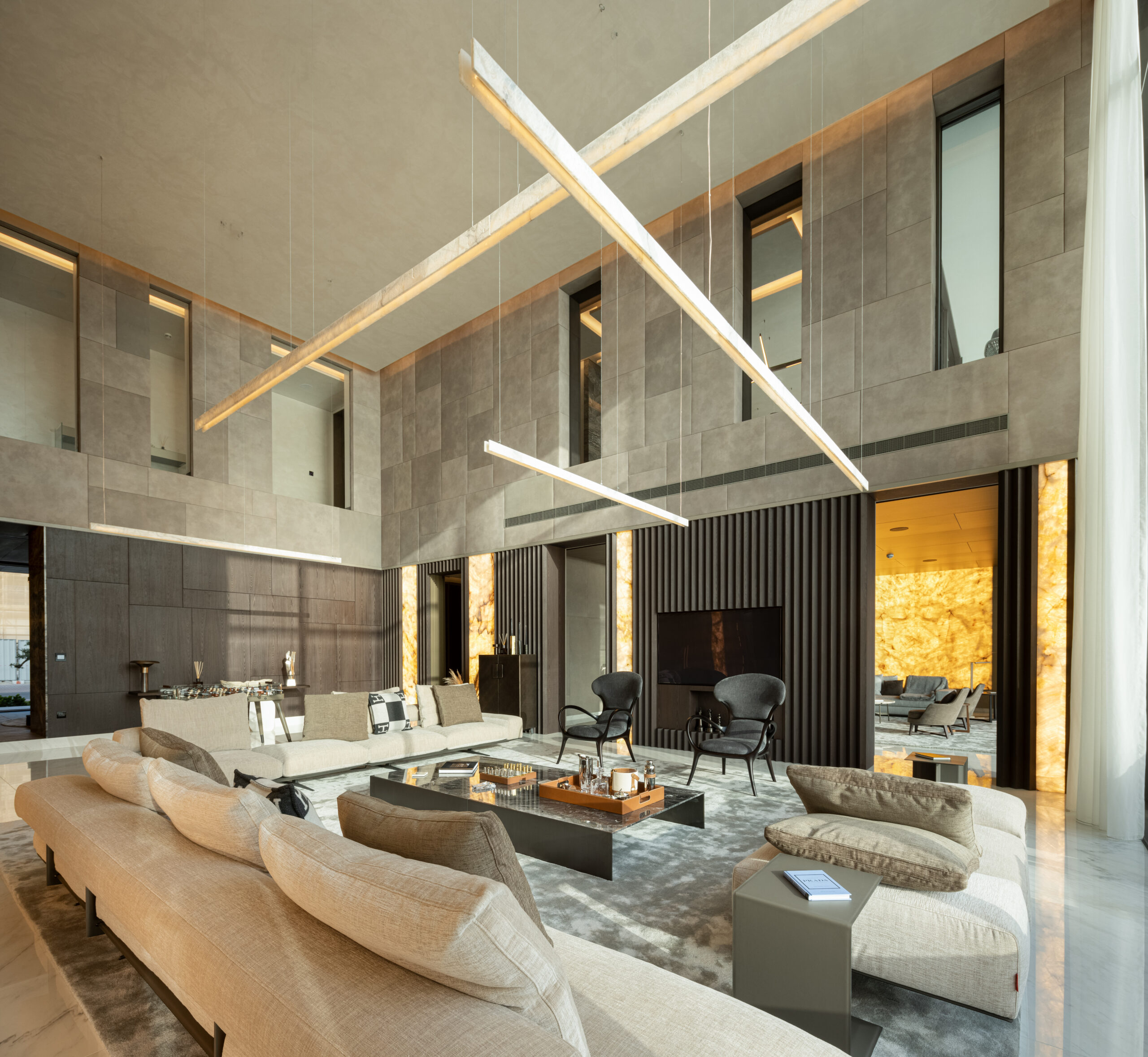 The alchemies of the luminous reflections reverberate like loud echoes through rhythmic repetition of slender glowing onyx slabs that, with their counterpoints and statements,generate an exquisite leitmotif, unifying pattern for the open plan composition.