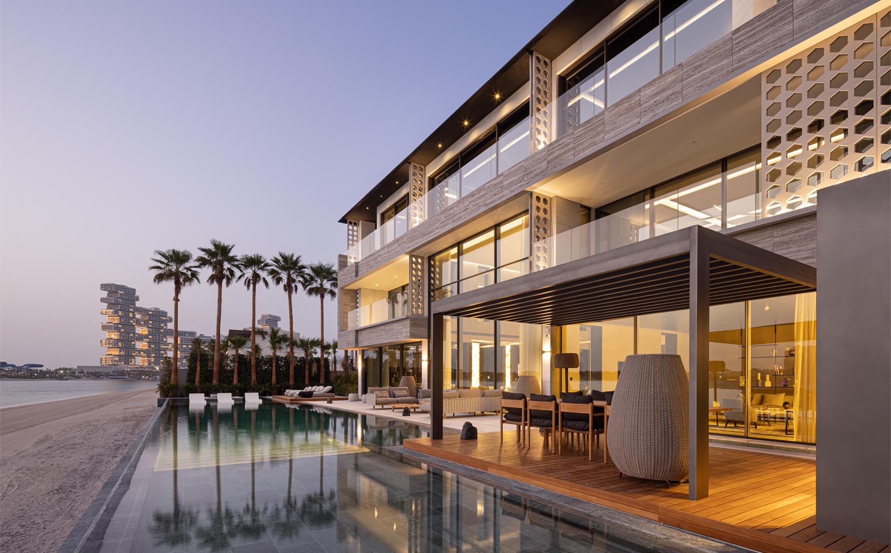 The four-story seafront residence, which features amenities as an underwater basement garage, the first of its kind on the Palm, masterfully fulfills the aspiration of enhancing the blur between indoor/outdoor, maximizing the residents experience of a harmonious lifestyle with privacy and lavish comfort.