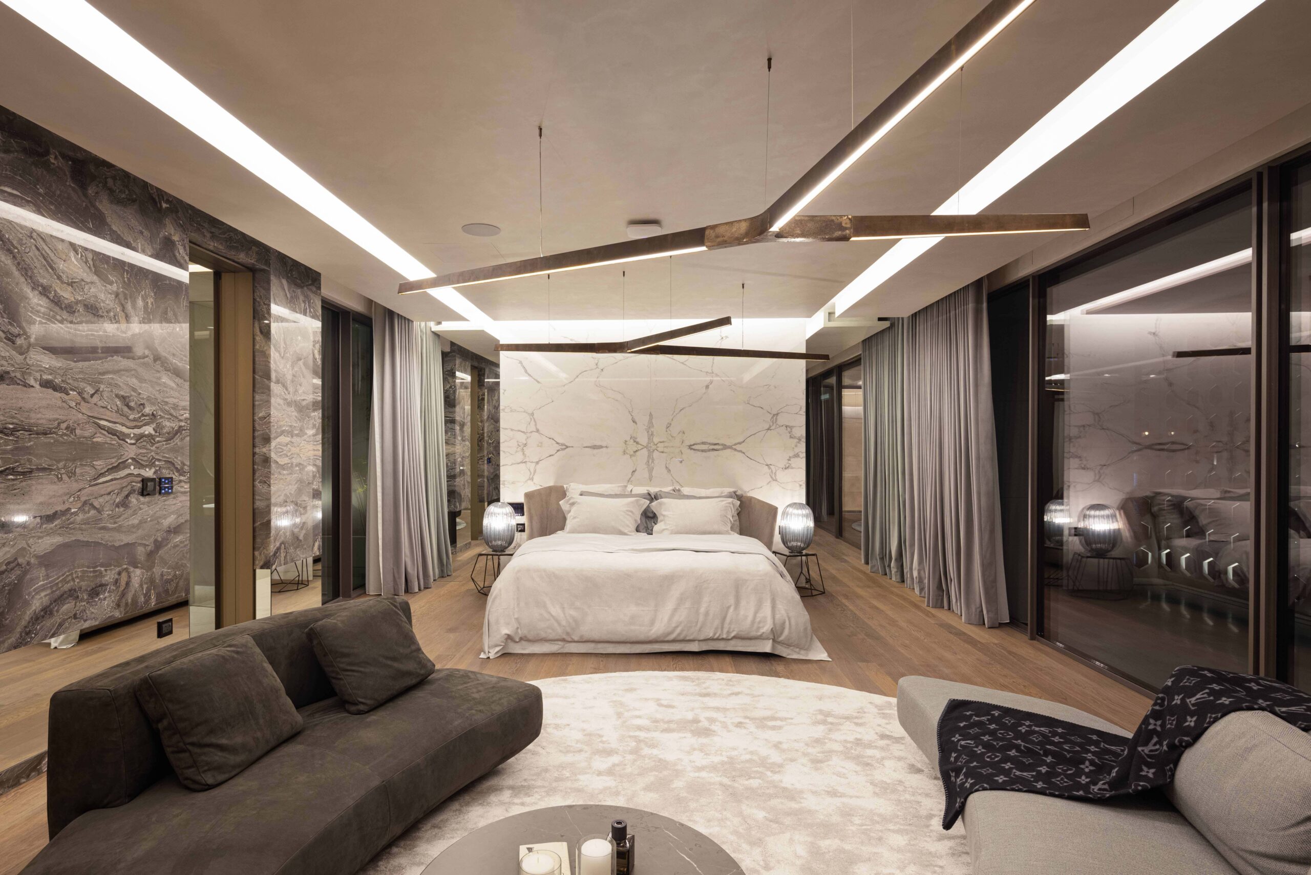 A book match version of the Italian marble Arabescato Orobico grigio introduces to an extensive, central double-volume, which acts as the principal living space, exalted in the clarity of its amazing spatial quality by the sharpness of detailing and control of materials combinations. Incisive, asymmetrical intersections of the long, rectangular Crystal light rods, hovering in the air with their daring linear geometries and precious texture, play an enticing role, adding layers of sensory and emotional richness.