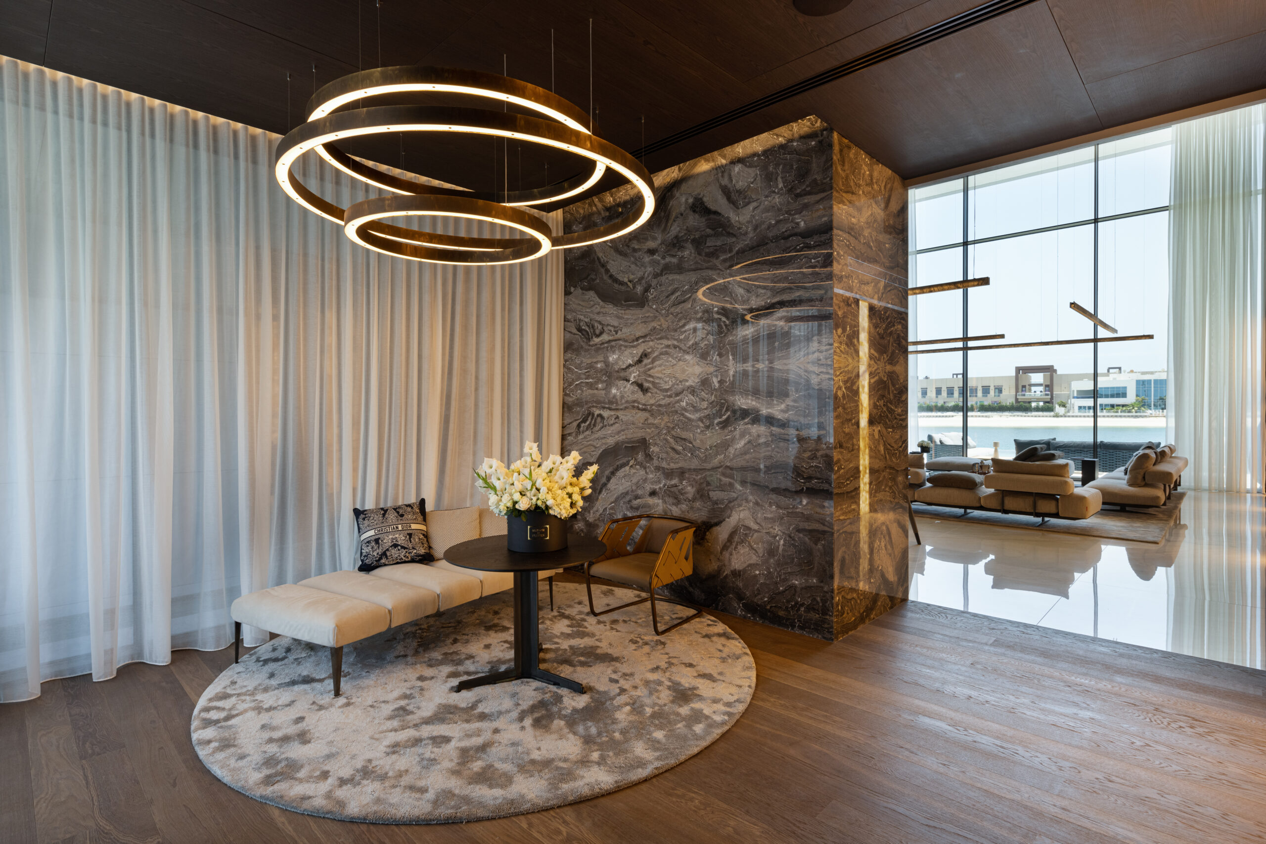 Incisive and sinuous lines, composure and indulgence expressed by the comfy formality of Vertigo daybed and the young easiness of Strip chair, two distinct characters flanked in complementarity, and completed by the sculptural concentric brass notes of a Light Ring Horizontal sequence, dictate the aesthetic code of a warm, welcoming conversation corner in the entrance hall.